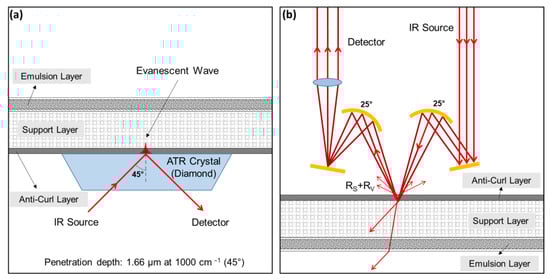 While these techniques are adequate for the identification of historic polymers in most objects, photographic film represents a significant challenge for infrared spectroscopy due to both sides of the film support commonly being covered with layers of gelatin: silver halide emulsion on the front side and anti-curl layer on the back [16]. The presence of gelatin coatings is likely to interfere with most non-invasive methods, such as FTIR and NIR. The application of ATR spectroscopy only provides information about the material composition of the first approximately 2 µm of an examined surface in contact with the ATR crystal; the deeper layers of a material are hardly reached by the incident IR beam (Figure 1a). To reach these deeper material layers, external reflection is a conceivable and truly non-invasive and contactless alternative measurement (Figure 1b). However, the penetration depth and intensity of reflection of the IR beam depends on various factors, and a part of the IR beam emerges on the transparent back of the sample without contributing to the resulting spectrum [15]. In search of a rapid and definitive technique for the material characterization of negatives and films via FTIR spectroscopy, transflection using an aluminum foil reflector was applied for the first time.