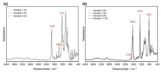 ATR spectra of (a) Samples 1–3, identified as cellulose acetate (A); and (b) Samples 5, 7, 8 and 11, identified as cellulose nitrate (N). Spectra were collected from the front side (non-image side) of the historical films.