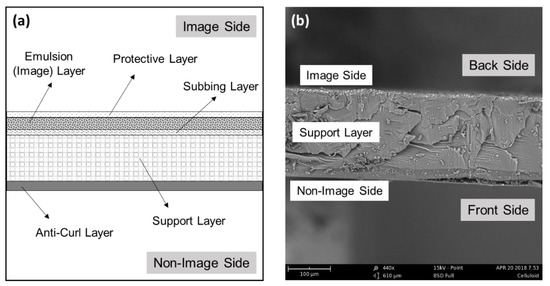 Negative films are structured materials consisting of several layers with different chemical compositions, as depicted in Figure 3. The number and thickness of these layers widely vary depending on the film type and manufacturer. In a simplified way, a black-and-white photographic film comprises an emulsion layer (colloidal silver salts dispersed in gelatin) where the image is formed, a transparent polymeric support (cellulose derivative or polyester) and a subbing layer (a mixture of cellulose derivative and gelatin) to ensure adhesion between emulsion and support. Additionally, antihalation/antistatic layers and protective anti-scratch/anti-curl layers made of clear gelatin are also part of the film structure [16,32] (see Figure 3a). Moreover, color negatives possess at least three different emulsion layers (sensitive to blue, green and red light) and additional filter and spacer layers. This means that the film support will normally be closer to the surface of the non-image side of developed films.