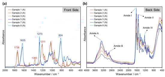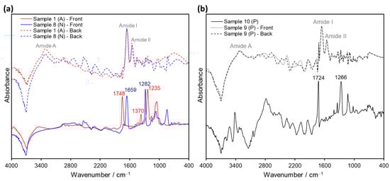 On the other hand, it has been suggested that reflection measurements afford slightly deeper penetration into the sample than the ATR method [31], even though both of them are surface-analysis techniques. Therefore, reflection analyses were carried out on both sides of the sample films in order to investigate the detection capacity for the inner support layer. However, the evaluation of the reflection spectra of Samples 1–8 after KK revealed that only the measurements on the front side permitted the discrimination between cellulose acetate and cellulose nitrate, as exemplified in Figure 7a for Samples 1 and 8, respectively. Conversely, the analysis of the back side of the films yielded only signals corresponding to gelatin (e.g., Amide A at 3315 cm−1, Amide I at 1659 cm−1 and Amide II at 1555 cm−1), as previously observed for ATR. The same issue was encountered for Sample 9 (see Figure 7b), for which neither front nor back side measurements retrieved the expected signals for PET (especially the strong carbonyl and terephthalate signals, which were observed in Sample 10 at 1724 and 1266 cm−1, respectively).