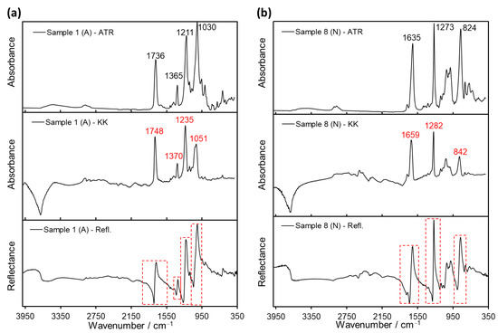 Comparison of raw ER spectra (bottom), their respective pseudo-absorption spectra calculated after KK transformation (middle) and ATR spectra (top) of films: (a) Sample 1 (cellulose acetate, A) and (b) Sample 8 (cellulose nitrate, N). The derivative-like bands in the reflection spectra (red dashed lines) are transformed into absorption-like bands by the KK algorithm and resemble the absorption bands in the ATR spectra. Both reflection and ATR spectra were recorded from the front side (non-image side) of the historical films.