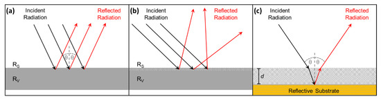 As mentioned above, both the RS and RV contribute to the resulting ER spectrum depending on the various sample properties. Furthermore, RS and RV exhibit an angular distribution of reflected radiation; that is, light can be reflected either at the same angle of incidence (see Figure 8a) or at different angles (see Figure 8b). The former case is termed “specular reflection” and the latter “diffuse reflection”, both of which can take place at the surface (RS), as well as at the volume (RV), level of the sample [15,18,21]. Specular reflection is typical for smooth and shiny samples, while diffuse reflection is more relevant for rough samples with good light-scattering properties [25]. Another phenomenon related to RV is the so-called transflection, which occurs when an at least partially transparent sample is placed in front of a smooth reflective substrate or mirror (e.g., a metal surface) [15,21,25]. For transflection, the incident radiation first passes through the volume of the sample until it reaches the metal substrate, where it is specularly reflected and passes a second time through the sample (see Figure 8c). Therefore, the transflection phenomenon usually generates reflection spectra that resemble transmission bands of the analyzed material [21].