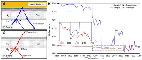 The double transmission of incident light through the sample that takes place during transflection increases the intensity of the reflection signals and enhances their RV component [15] (Figure 9). Hence, a typical transflection spectrum consists of derivative-like bands at lower wavenumbers corresponding to RS, along with very intense bands associated with RV at higher wavenumbers, as exemplified in Figure 9c for Sample 7, in the spectral regions 1700–600 cm−1 (RS) and 4500–1700 cm−1 (RV).