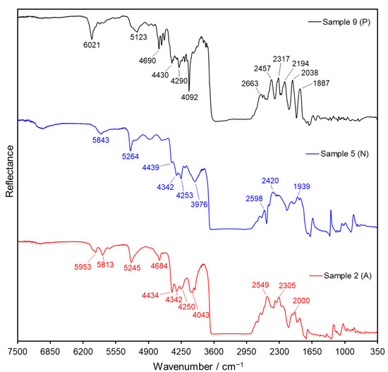 The transflection spectra of cellulose acetate, cellulose nitrate and polyester are markedly different (as exemplified in Figure 10 for Samples 2, 5 and 9, respectively), displaying particular signals that permit their identification. The first region of interest extends through the short-wavelength infrared from 6150 to 3600 cm−1, in which transmission-like bands can be observed. In this region, the cellulose derivatives display a similar spectral pattern that is distinct from the signals observed in the polyester sample. Cellulose nitrate exhibit broad bands at 3976, 5264 and 5843 cm−1, which are also found in the spectrum of cellulose acetate at slightly different positions, namely 4043, 5245 and 5813/5953 cm−1 (here two peaks instead of one). The signals at 4250, 4342 and 4435 cm−1 are common to both spectra; however, for cellulose acetate, they have the same height, and for cellulose nitrate, they decrease in reflectance intensity from left to right in the spectrum. In addition, cellulose acetate shows a band at 4684 cm−1, which is absent in the spectrum of cellulose nitrate. Contrarily, the spectrum of polyester exhibit sharper signals, with the most important of them located at 4092, 4290, 4430, 4690, 5123 and 6021 cm−1 (see Figure 10).