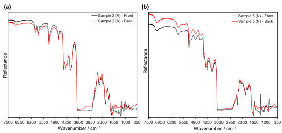 Comparison of transflection spectra of (a) Sample 2 (cellulose acetate, A) and (b) Sample 5 (cellulose nitrate, N). Measurements were performed on the front (black) and the back (red) side of the films.