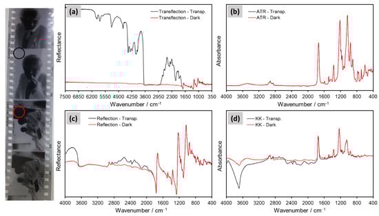Nevertheless, a disadvantage of the transflection method in comparison to ER and ATR measurements is that the analyses have to be carried out in transparent areas of the film. As depicted in Figure 9a, during transflection, the incident light must pass through the film to be reflected by the metal surface. If the optical density of the sample is too high, the radiation will be reflected at the surface and will not reach the metal reflector [8]. Film negatives usually have dark optically denser areas where the image is present, in which material identification via transflection is not possible. As shown in Figure 12 for Sample 4 (cellulose acetate), the RV signal enhancement accomplished by transflection was only observed when transparent areas of the film were analyzed. Contrarily, the main signals in the ATR and ER (KK) spectra did not change significantly when dark areas in the film were sampled (Figure 12). In fact, transflection spectra collected from dark areas of the film correspond well to ER spectra recorded from transparent areas of the film. Plausibly, in both cases, the incident light is reflected at the surface of the film (no back reflection) and the RS component dominates the spectra (see Supplementary Figure S4). This issue can be also encountered in degrading films, which exhibit dark staining of the film base, appearance of oxidation marks, decomposition of silver complexes and image discoloration. Such signs of degradation that are present in many film collections increase the optical density of the once-transparent areas of the film and hinder the analysis via transflection spectroscopy.