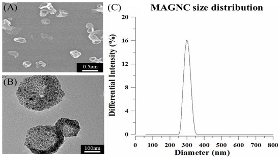 (A) SEM image of MAGNC; (B) TEM image of MAGNCs; (C) particle size of the MAGNCs was ~300 nm, as determined using a DLS instrument.