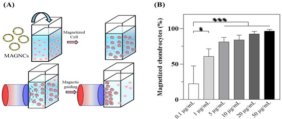 (A) Scheme of cell guiding efficiency experiment. (B) Evaluation of magnetized chondrocytes at different concentrations of MAGNCs cultured with chondrocytes (n = 3). Data represent mean ± SD, * p < 0.05, *** p < 0.001.