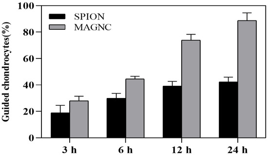 Evaluation of the magnetic-guiding ability of chondrocytes co-cultured with SPIONs and MAGNCs at 20 μg/mL at different time points (n = 3).