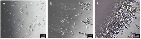 Distribution and movement of chondrocytes under applied magnetic field. Chondrocytes were incubated with different magnetic nanoparticles at 20 µg/mL and analyzed after 12 h of incubation on an inverted microscope for (A) chondrocytes alone, (B) chondrocytes treated with SPIONs, and (C) magnetized chondrocytes using MAGNCs.