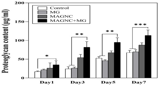 sGAG secretion in cultures with different stimulations (MG, MAGNCs, and MAGNCs+MG) at 1, 3, 5, and 7 days (n = 3). Data represent mean ± SD, * p < 0.05, ** p < 0.01, *** p < 0.001.