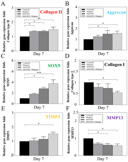 To evaluate the chondrogenic biofunctionality under the magnetic-guiding effect, the expression levels of six types of cartilage-related genes, including collagen type II (Col II), aggrecan (Agg), SOX9, TIMP3, collagen type I (Col I), and MMP13, were quantified using RT-qPCR for the chondrocytes treated with MAGNC, MG, or MAGNC+MG for 7 days. Col II and Agg are the predominant ECM components of articular cartilage and chondrogenic-related markers [28,29]. As shown in Figure 6A,B, the expression of the chondrogenic-related marker genes Col II and Agg was higher in the MAGNC+MG group than in the other groups. SOX9 is a key transcription factor involved in chondrogenic differentiation [30,31]. The gene expression of SOX9 (Figure 6C) was also upregulated by 3.7-fold in the MAGNC+MG group than in the control group, thus indicating a significant enhancement in the expression of chondrogenic-specific genes in the MAGNC+MG group. The phenomenon of chondrocyte dedifferentiation and biofunctionality deactivation has been a major hurdle in the development of cell therapies. It is worth mentioning that in Figure 6D, chondrocytes treated with MAGNC+MG exhibit significantly decreased Col I gene expression, which has been regarded as a dedifferentiation marker [32]. Moreover, MMP13 digests ECM molecules, including cartilage Col II and proteoglycan, whereas TIMP3 inhibits MMP13 by forming high-affinity complexes [33,34]. As shown in Figure 6E,F, chondrocytes treated with MAGNC+MG showed increased expression of TIMP3 and decreased expression of MMP13, indicating that treatment with MAGNC+MG can downregulate the gene expression of MMP13 and further prevent the degradation of ECM components. These results likely reflect that GAG synthesis was the highest in the MAGNC+MG group (Figure 5). The above results revealed that MAGNCs served as magnetic navigation while enhancing the differentiated phenotype and biofunctionality of magnetized chondrocytes.