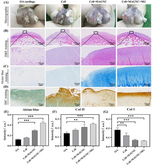Macrographic observation and histological evaluation of magnetic-guiding outcome in the articular cartilage of OA animal model at 8 weeks post intra-articular injection. (A) Macrographic observation following treatment with Cell, Cell+MAGNC, or Cell+MAGNC+MG; (B) H&E staining of articular cartilage repairing sections following treatment with Cell, Cell+MAGNC, or Cell+MAGNC+MG with magnetic guidance 8 weeks post- osteoarthritis; (C) Evaluation of sGAG staining cartilages with Alcian blue following treatment with Cell, Cell+MAGNC, or Cell+MAGNC+MG with magnetic guidance 8 weeks post-osteoarthritis; (D) immunohistochemistry for Col I and II to observe the pathological and the repaired behavior via MAGNC, MG, and MAGNCs/MG in tandem with cell therapy at week 8; (E) optical density analysis of Alcian blue staining, immunohistochemistry for (F) Col II and (G) Col I. Data represent mean ± SD, ** p < 0.01, *** p < 0.001.
