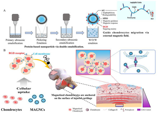Schematic illustration of (A) the synthesis of magnetic amphiphilic-gelatin nanocarriers (MAGNCs) composed of superparamagnetic iron oxide nanoparticles (SPIONs) and amphiphilic gelatin (AG) with RGD to bind and guide chondrocytes; (B) magnetized chondrocytes were guided and formed high-density horizontal stacking on the superficial zone of damaged cartilage via internal magnetic force for promoting cartilage repair.