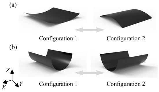 Based on the manufacturing process, bistable polymer composite structures can be categorized into unsymmetric cross-ply and antisymmetric layups, as shown in Figure 1. The unsymmetric cross-ply laminate (CPL) is obtained by holding and curing at a high temperature and naturally cooling to room temperature [40], whereas the antisymmetric cylindrical shell (ACS) is obtained using a cylindrical steel mold rather than residual thermal stresses [41]. The configurations of the two types of bistable polymer composite structures are relatively regular cylinders. However, the principal curvature directions of the two stable configurations of unsymmetric CPLs are different, whereas those of ACSs are the same.