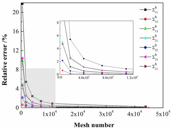 The closed-form solution of the elliptical domain has been given in [48]. When considering the selection of different in the FEniCS project, the variation of with the number of mesh could be obtained. Thus, the relative error between the numerical solution and the closed form could be obtained, as shown in Figure 2. As the number of mesh increases, choosing various generates a sufficiently accurate value of . However, it can be seen from Figure 2 that the relative error calculated by selecting under the same number of mesh is the smallest. Therefore, consider choosing to calculate the value of .