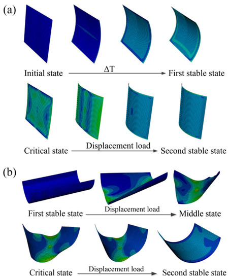 Although the analytical model can predict stable states conveniently, validation based on finite element analysis (FEA) is still required to confirm the accuracy of the predictions. However, even in this validation stage, the analytical model plays a key role in finding different stable configurations. The material properties used in the numerical simulation are listed in Table 1. The nonlinear finite element software ABAQUS was used to simulate the morphing processes of the bistable polymer composite structures, as shown in Figure 3. For the two different types of bistable polymer composite structures, the simulation process varied.