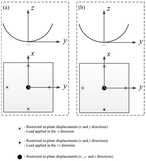 Reduced integration can provide more accurate results and significantly reduced computational time. The S4R reduced integration shell element is chosen here for its better convergence. The FEA process for the CPL includes four steps: (1) Modeling process: The CPL was modeled with a planar shell (3D deformable shell), and the stacking sequence was [0/90]. (2) Curing process: An initial temperature field of 140 °C was applied to the laminate and was then reduced to 20 °C to obtain the first stable state. (3) Loading process: To obtain another stable state, as shown in Figure 4a, the center node of the laminate was fully constrained, and four displacement loads in the same direction were applied on the midpoints of the four boundaries. The options were set as “Nlgeom”, and stabilization with dissipated energy fraction was utilized as a default parameter. (4) Unloading process: We deactivated the displacement loads to obtain the second stable state with the option Nlgeom still on and stabilize off to avoid inaccuracies.