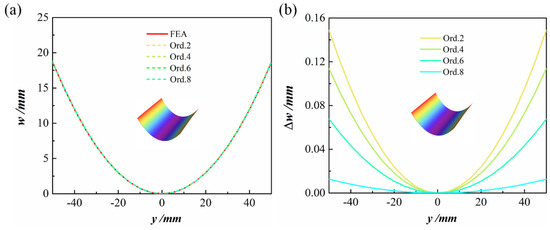 To highlight the difference between various orders and the FEA results more intuitively, Figure 5 shows the cross-section configuration of the second stable state of , [0/90] CPL. It can be seen from Figure 5a that increasing the order does not lead to a major difference in the configuration diagram. Moreover, as shown the Figure 5b, the maximum error between the theoretical model and the FE result is at the edge. The maximum errors between the theoretical results of Ord. 2, Ord. 4, Ord. 6, and Ord. 8 and those of the finite element simulation were 0.149, 0.114, 0.068, and 0.013 mm, respectively. The relative error was reduced from 0.797% for Ord. 2 to 0.068% for Ord. 8. The prediction accuracy of the model increased with the order, but the number of degrees of freedom did not increase. The computational time did not increase either.