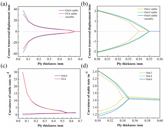 In the next analysis, we maintained other parameters constant and changed the ply thickness of the CPL to obtain the relationships between corner transversal displacement, curvatures of the stable state, and ply thickness, as shown in Figure 7. When the CPL is in a stable configuration, the corner transversal displacement and curvature of the stable state decrease nonlinearly with the increase in the ply thickness, and bifurcation occurs. From Ord. 2 to Ord. 6, the prediction values of the thickness bifurcation point were 0.54, 0.55, and 0.55 mm, respectively.