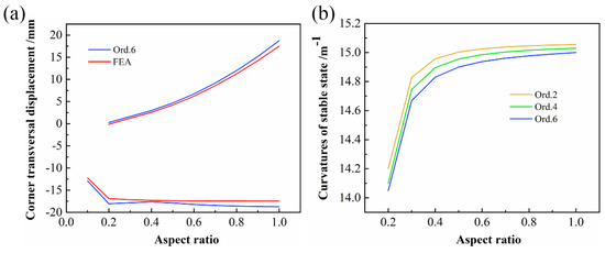 The effect of the aspect ratio on the stable configuration of CPL is shown in Figure 8. Side length b was held constant, and the aspect ratio was changed by changing the value of side length a. As the aspect ratio decreased, the solutions reached a turning point and the plate lost its bistability. The transversal displacement of the corner points is less affected by the width of the laminate when the CPL has two stable configurations and bends along the length. Figure 8b shows the relationship between the curvature of the second stable state and the aspect ratio. Curves of all orders were within a similar range of aspect ratio, showing an increasing trend and then converging to a certain value.