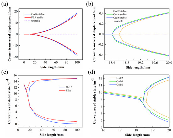 In order to explore the influence of side length on the stable configuration of CPL, the aspect ratio of CPL was kept at 1. As shown in Figure 9, as the side length increases, the bifurcation phenomenon reappears. The predicted bifurcation point of Ord. 2 was 18.6 mm, whereas the Ord. 4 and Ord. 6 points were both 18.4 mm. Moreover, as the order increased, the bifurcation point once again converged to Ord. 6. Figure 9c,d shows that the overall trends of curvature prediction with various order assumptions are approximately the same.