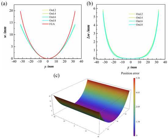 The cross-section configuration of second stable state of ACS: (a) out-of-plane displacement at x = 0 of the second stable state; (b) differences with respect to FEA; (c) position error between predictions at Ord. 8 and FEA.