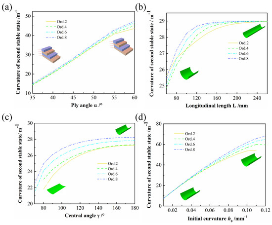 As the first stable state of ACS is determined by the mold, only the variation of the curvature of the second stable state is discussed here. As shown in Figure 11a, the curves of various orders predicting the influence of the ply angle on the curvature of the second stable state are essentially coincident. When the ply angle was relatively large, the prediction results from Ord. 2 to Ord. 8 showed that the higher the order was, the larger the curvature of the second stable state became. However, the maximum relative error between the minimum value of Ord. 2 and the maximum value of Ord. 8 did not exceed 8%. All showed a gradually increasing trend of curvature of the second stable state and demonstrated that the ply angle had a significant influence on the bistability of ACS.