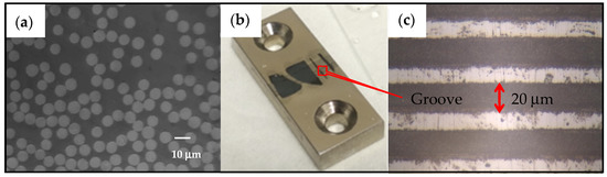 Images of (a) polished thin-composites plate, (b) thin composite plates mounted on the metal sample support and (c) magnified grooves made on the sample support.