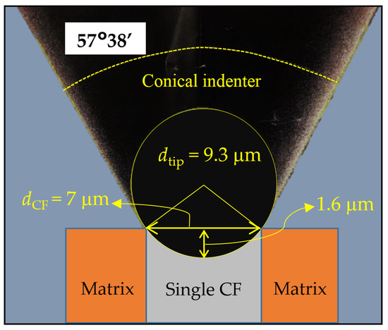 IFSS and the interaction between CFs and the surrounding resin were studied by micro push-out testing using a NanoTest Vantage system (Micro Materials Ltd., Wrexham, UK) with a diamond conical tip of 9.3 μm in diameter. The load was applied and released at a constant rate of 0.5 mN/s and the dwell period at the maximum load was set as 5 s for all tests. The individual fibre to be pushed out from the matrix was selected using a 400× optical microscope attached to the NanoTest system to represent the typical fibre-matrix distribution without any appreciable interface defects or damages. According to the geometries, as shown in Figure 3, the maximum indenter displacement before touching the adjacent matrix was calculated to be 1.6 μm when the indenter tip was precisely positioned to the centre of the fibre.
