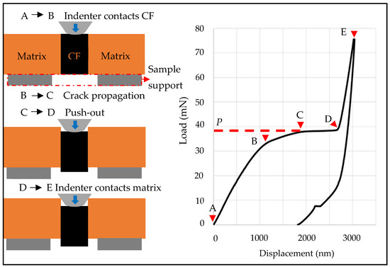 The nano-indentation push-out test requires precise positioning and alignment of the indenter with the CF sample during the experiment. A typical load–displacement curve combined with the schematics of the test are shown in Figure 4, illustrating various stages of the push-out test. At the beginning of the initial linear part of the load–displacement curve (Point A), the conical indenter came into contact with the top surface of the CF. As the applied load increased (Points A to B), the indenter displacement increased to about 1.2 μm due to the elastic deformation of the fibre/matrix system and the plastic deformation of the fibre.