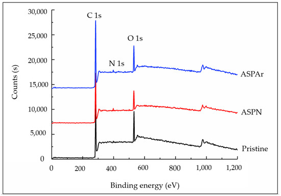 XPS surface survey spectra of pristine, ASPN and ASPAr-treated CFs.