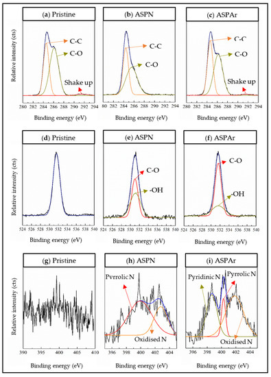 The most noticeable change in the XPS spectra was observed in the N 1s region, where the intensity of the signal increased after both the ASPN and the ASPAr treatments, and the shape of the peaks changed significantly. These changes could be attributed to the introduction of N-containing groups by the ASP treatments. As shown in Figure 7h,i, pyrrolic N and oxidised N groups were found on both ASPN and ASPAr-treated fibre surfaces with the binding energies at around 400.1 and 401.8–402.8 eV. This is because, during the ASP treatments, the CF surfaces were exposed to the energetic plasma species (ions, atoms, electrons, free radicals and other species), whose interactions contributed to creating active sites for the attachment of nitrogen species to form functional groups.