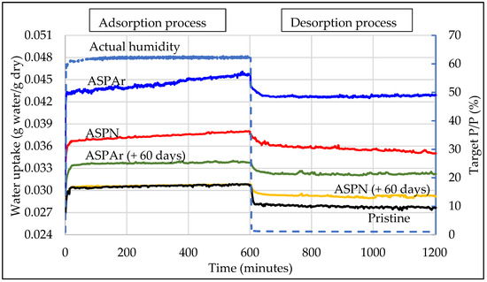 Figure 8 shows the measured water-uptake variations with time at relative humidities of 60% and 0% for the pristine and ASP-treated CFs, manifesting the adsorption process and desorption process. It can be seen that the actual relative humidity for the adsorption and desorption processes was very stable and slightly higher than the pre-set values of 60% and 0%.