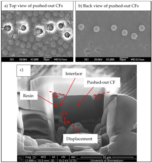 The top and back sides of the tested composites were observed by SEM, and some typical micrographs are shown in Figure 9. It can be seen clearly from both the top (Figure 9a) and the back sides (Figure 9b) that the tested fibres were pushed out successfully. The pushed-out fibres were presented in a row because of the geometry of the grooves on the sample support. Furthermore, the longitudinal interface between the pushed-out CF and the matrix was examined by Focused Ion Beam (FIB)/SEM. As shown in Figure 9c, the fibre was pushed out, evidenced by a ~2 μm push-out step clearly shown between the matrix and the CF on the back side. In addition, plastic deformation on the adjacent matrix was revealed on the top side as the dashed line. Clear debonding and cracking were observed at the CF/matrix interfaces near the top surface of the CF (Sites A) and near the exit site of the matrix (Site B).