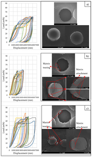 Figure 10 shows the force–displacement curves recorded during the micro-push-out tests of the thin composites made with pristine, ASPN and ASPAr CFs as the reinforcements, accompanied by detailed micrographs showing the typical views of the pushed-put fibres from the top and bottom side of the samples.