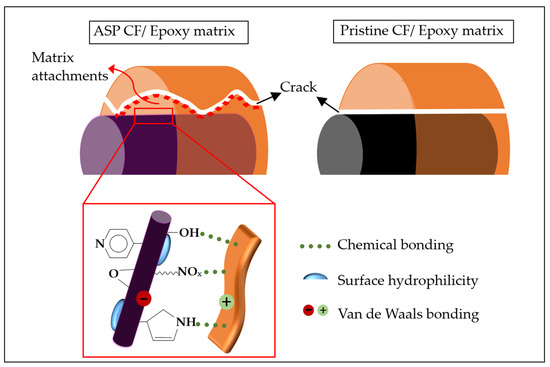 Schematic diagrams of interfacial failure mode of ASP CF/matrix and pristine CF/matrix.