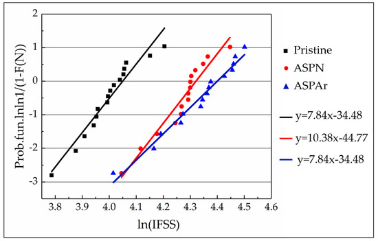 For this reason, a Weibull distribution was adopted to statistically analyse the push-out test data. The Weibull plots and the fitted straight lines for the IFSS of composites made with three types of CFs are presented in Figure 12, and the results of the Weibull statistical analysis are summarised in Table 4. It can be seen that the Weibull plots were approximately linear, and all the fitting coefficient values R2 were over 93%, signifying that the IFSS of all composites followed a Weibull distribution. The Weibull scaling parameters (τ) of IFSS after ASP treatments followed the same trend with the average IFSS values. In addition, the Weibull plots of IFSS for composites with ASP-treated CFs were clearly separated from the pristine system, highlighting that the improvements in the IFSS values were statistically significant. Another observation related to Table 4 is that the ASPAr treatment slightly reduced the Weibull modulus, indicating that the measured data from ASPAr treatments possessed a slightly larger scattering.