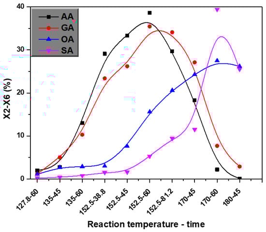 Figure 2 presents the relative content of X2, X3, X4, X5, X6 produced by SS under different reaction temperature and time. When the reaction temperature is increased, both X5 and X6 are cracked into XOS with lower molecular mass such as X2, X3 and X4. Same observations were obtained at different reaction time. The results showed that both process parameters (i.e., temperature and time) have noticeably influences on the molecular mass distribution of the resulted products. Figure 2a,b demonstrate the influence of different reaction time on the yield of X2–X6. When the hydrolysis undergone longer, both X2 and X3 increased whereas for X5, X6 and >X6, the hydrolysis process was continued until producing oligosaccharides with lower molecular mass such as X2, X3 and X4. It can be clearly observed that a relatively low yield of X5 and X6 was obtained at high temperature (170 °C, 75 min) with organic acid pretreatment. Although the higher yield of XOS could be attained by the use of concentrated acid or prolong process time, the unwanted side products such as furfural, hydroxymethyl furfural and other harmful substances might be resulted [26].