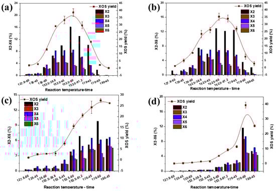 The yields of X2–X6 produced from sorghum stalks with different reaction temperature and time under different acids ((a) Acetic acid, (b) Gluconic acid, (c) Oxalic acid, (d) Sulfuric acid).