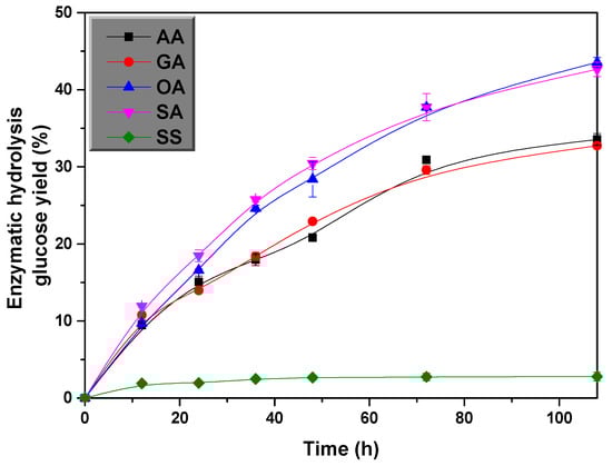 When the maximum XOS was obtained by hydrolysis of SS with different acid pretreatment, the chemical properties of the pretreated solid fraction was identified (Table 2). In favor of optimizing the yield of the pretreated materials, the residues pretreated with different acids were mixed with 20 FPIU/g of glucan to perform the enzymatic hydrolysis under process time of 108 h, the results are displayed in Figure 3. Among them, the enzymatic hydrolysis yield obtained from SS pretreated with OA and SA was the highest (exceeding 42%). Zhang et al. [27] obtained 43.6% yield from the combination of supercritical CO2 and ultrasonic pretreatment on SS. In this research, approximately 33% yield were obtained from the enzymatic hydrolysis of AA and GA pretreated SS, while the XOS yields produced was 38.6% and 32.1%, respectively, indicating that both AA and GA pretreatments fully removed the hemicellulose in the SS.
