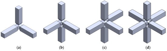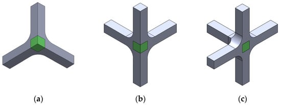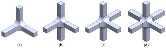 According to the restrictions imposed by the UCLM installation, two triaxial cruciform geometries are proposed. Geometry A and geometry B are shown in Figure 2 and Figure 3, respectively, for the four possible loading cases: (a) compression-compression-compression (CCC), (b) compression-tension-compression (CTC), (c) compression-tension-tension (CTT), and (d) tension-tension-tension (TTT). The specimens seek to leave free zones for measuring the strains in the triaxially loaded region, avoiding as far as possible the full geometry with six arms (Figure 2d and Figure 3d). It is decided that the axes loaded under tension are to have two arms for avoiding undesirable flexion during loading. Meanwhile, the compressed directions consist of a single arm and the fixing system is designed to restrain the displacements in the opposite perpendicular plane (Figure 4). The baseline specimens for the FEM parametric study have an arm length of 40 mm and a squared cross-section of 10 mm side. Therefore, the central cubic region submitted to triaxial loading has the three dimensions of 10 mm. In geometry A, the arms are connected to the gauge region by means of a simple round, while in geometry B a double fillet radius is introduced.