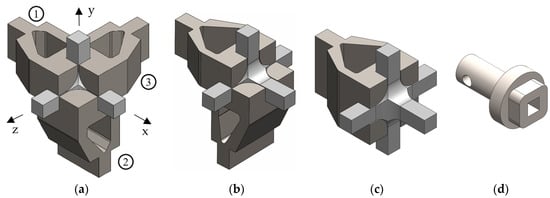 The clamping system is designed to keep the specimen in a fixed position during the test and to assure the alignment of the sample with the actuators under compression. The fixture consists of three supporting parts which, in Figure 4a, are numbered for the x-, y- and z-axes with the labels 1, 2, and 3 respectively. They impose the different boundary conditions for each loading case, requiring one constraining piece for each compressed arm. Then, if the three directions are submitted to compression, the three parts of the fixture have to be used (Figure 4a). Meanwhile, the CTT and CCT loading cases require one and two supporting parts, respectively (Figure 4b,c). No fixture is needed if the six arms are under tension, in which a pneumatic gripping of the specimen is proposed. The compressive loads are conceived to be applied by means of compression plates. To ensure that the arms subjected to compression do not buckle, external walls have been added to the proposed compression platen (Figure 4d). The fixture system is planned to be manufactured in a three-and-a-half-axis milling machine. The material is intended to be a 304 stainless steel, since it is feasible for CNC machining and presents a stiffness of a higher order of magnitude than the composites to be tested.
