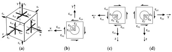 (a) Triaxial strain state; (b) strain gauge rosette in plane x-y; (c) strain gauge rosette in plane x-z; and (d) strain gauge rosette in plane y-z.