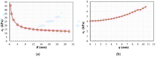 Focusing on the maximum principal stresses σI, the highest value in the whole specimen (expressed in absolute value) is depicted in Figure 8a as a function of the fillet radius R. The highest maximum principal stresses are obtained out of the gauge region, and they clearly increase with the reduction of the fillet radius. But the highest values present a decrease gradient apparently stable if R ≥ 10 mm. This should be considered for deciding which is the chosen fillet radius to achieve low stress concentrations out of the region of interest. The aim here is to delay the undesirable failure and to increase the loading range in which the triaxial response is observable in the centre of the specimen.