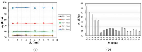 Geometry B demands a parametrization of both the internal and external radii that connect the arms and the gauge region (Figure 7b). As first step, these radii are varied between 1.0 mm ≤ Re ≤ 10.0 mm and 2.0 mm ≤ Ri ≤ 6.0 mm to find the best combination that reduces as far as possible the unavoidable stress concentration out of the gauge region. Figure 9a depicts the highest maximum principal stresses (in absolute value) as a function of Re and Ri, observing practically no influence of the external radius in the results. This fact makes possible to eliminate this variable from the analysis due to its little influence, fixing the external radius Re = 1 mm for the rest of the models. Meanwhile, the highest maximum principal stress decreases when Ri is reduced, obtaining the lowest value with internal radii around 2 mm.