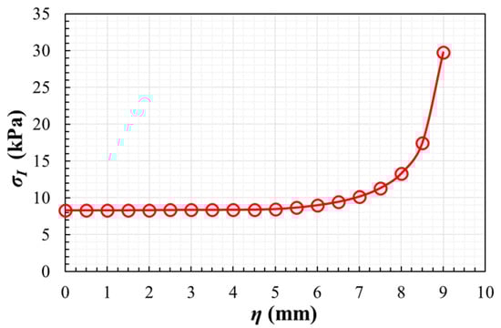 Continuing with the parametric study, Figure 9b illustrates the results of a second analysis which is carried out varying the internal radius between 1.1 mm ≤ Ri ≤ 2.9 mm. For an internal radius higher than 1.5 mm, lower stress concentration is found outside of the measurement area. In addition, with the scope of assuring the homogeneity of the stress fields in the gauge region, the maximum principal stresses are calculated along the path (Figure 7b) for the mentioned interval of Ri. Following the same procedure used in geometry A, Table 2 lists the -coordinate of the position along the path in which there is a variation of 5% and 10% from the maximum principal stress σ0 at a material point in the origin of coordinates. The results show that a larger internal radius causes less homogeneous stress fields. For example, Figure 10 depicts the evolution of the maximum principal stresses along the path for the case with fillet radii Re = 1 mm and Ri = 1.6 mm. Therefore, for minimizing the stress concentration out of the region of interest and increasing the fields homogeneity in the central zone, the compromise value Ri = 1.6 mm is chosen. Taking into account this decision, it should be noted that Re = 1 mm is selected since it produces a smoother transition with the arm of the specimen and it facilitates its machining in the case that this is the fabrication method chosen.