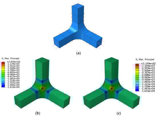 The response of geometry A for a case CTC under two different loading scenarios is selected to be studied due to its relatively complexity. In the loading scenario −50/50/−50, stresses of MPa in the x-direction, 50 MPa in the y-direction and 50 MPa in the z-direction are applied in the arms of the specimens. Meanwhile, the stresses utilized in the loading scenario −50/25/−50 are 50 MPa in the x-direction, 25 MPa in the y-direction and 50 MPa in the z-direction. Figure 15a shows the specimen with its full configuration, but the simulation is developed studying one half of the geometry taking advantage of the symmetry (Figure 15b). The boundary conditions imposed by the fixture are taken into account.