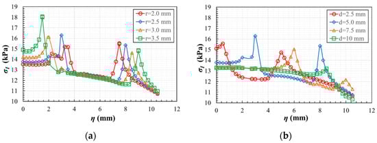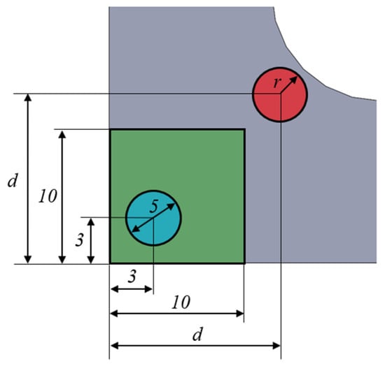 As well, the supporting system has to accomplish the main objective of letting measure the strain state of the triaxially loaded region during the tests. If a strain rosette is used, machined holes in the fixture are required for connecting its wires to the data acquisition system. The opening should have an influence on the measurable strains as low as possible. With this scope, a study of the homogeneity of the maximum principal stresses in the gauge region is carried out, comparing different hole diameters and their position on the fixture. In Figure 12, the squared area with a side of 10 mm that is marked in green over the specimen is the measuring zone. The blue circle represents the planned position of the strain rosette with 5 mm of diameter. It was decided that its centre should be located at 3 mm of the specimen edges, in order to assure that the 3 mm strain gauges are placed within a region in which the maximum principal stresses vary less than 10% of the central value (see Section 3.1.1). Meanwhile, the red circle symbolizes the opening that the fixing system should have for extracting the cables of the strain gauges. Its radius r and the centre position d are parametrized for reviewing its influence on the homogeneity of the stress fields. The opening radius varies between 2.0 mm ≤ r ≤ 3.5 mm and the hole centre varies between 2.5 mm ≤ d ≤ 10.0 mm, allowing for the perpendicular displacements of the specimen in the opened region. The analysis is developed applying a triaxial compressive stress of 10 kPa on geometry A with R = 10 mm and the real boundary conditions applied by the fixture. As a result, the maximum principal stresses are observed along the path described in Figure 7a.