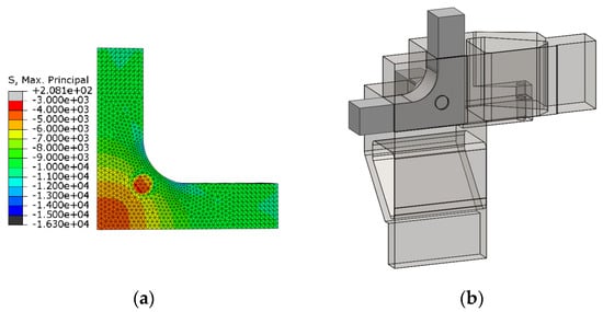 In geometry A for the CCC loading case: (a) Maximum principal stress field with an opening with r = 2.5 mm and d = 10 mm; (b) sketch of the fixture with a cut for visualizing the position and diameter of the opening.